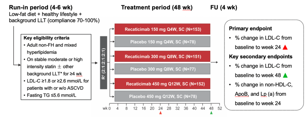REMAIN-2研究是一项随机、双盲、安慰剂对照的III期研究(NCT04885218),参研中心共62家。研究纳入接受中高强度他汀类药物(±胆固醇吸收抑制剂±非诺贝特)稳定治疗≥4 周后LDL-C仍不达标(即无动脉粥样硬化性心血管疾病 [ASCVD]者LDL-C≥2.6 mmol/L、患有ASCVD者LDL-C≥1.8 mmol/L)的成人非家族性高胆固醇血症和混合型高脂血症患者,且随机前空腹甘油三酯≤5.6 mol/L,按2:2:2:1:1:1随机后接受皮下注射瑞卡西单抗150 mg Q4W(4周一次)、300 mg Q8W(8周一次)、450 mg Q12W(12周一次)或对应安慰剂治疗,治疗周期共48周。